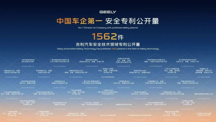 吉利首先以1562件专利数位列中汽中心发布的汽车安全技术领域专利公开量榜单中国品牌第一。专利数量的背后,是其作为“标准制定者”的行业角色。近期工信部公示的《汽车车门把手安全技术要求》强制性国家标准,正是由吉利牵头起草。截至今年3月,吉利已主导及参与了115项安全领域的标准制定。