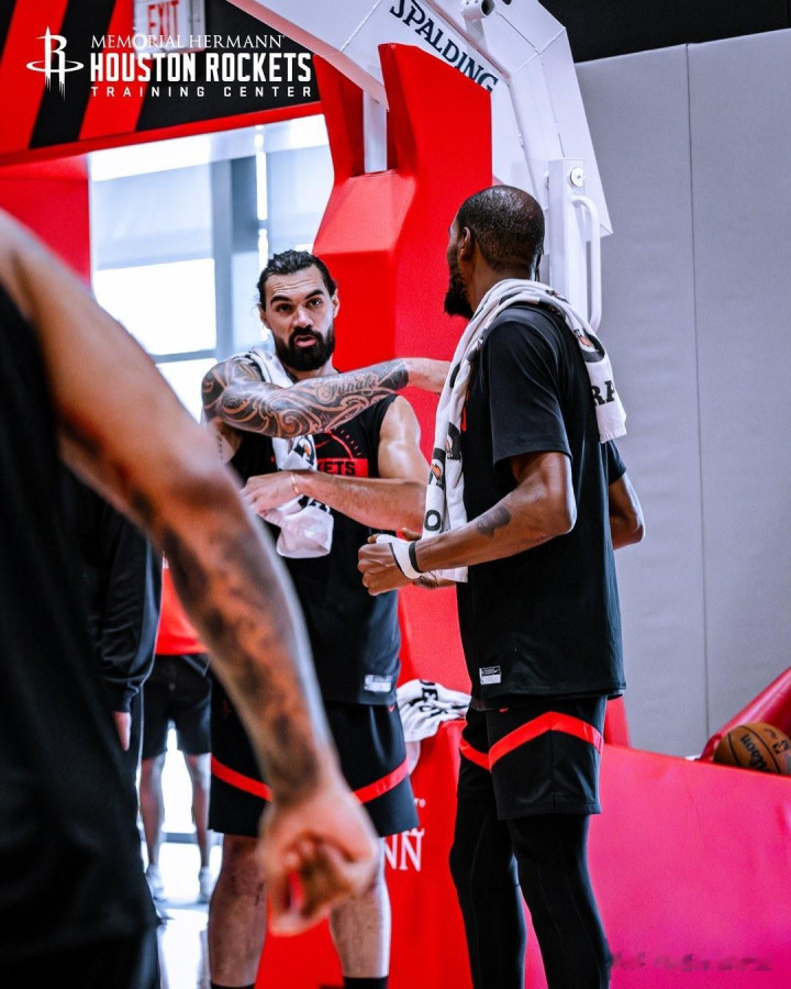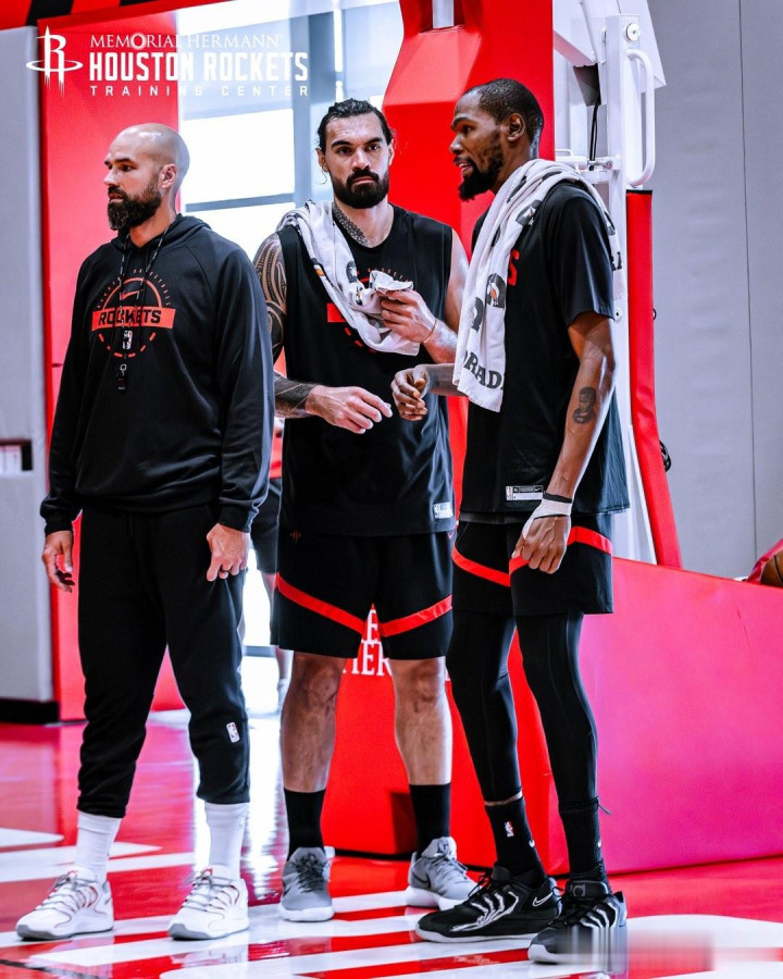 训练期间,“死神”杜兰特和“海王”亚当斯站在底线附近进行了一番交流;火箭众将正在积极备战,不过火箭也遭遇伤病困扰,范弗利特已经接受了前十字韧带修复手术,可能缺席新赛季的全部比赛,火箭新援芬尼-史密斯也在养伤。